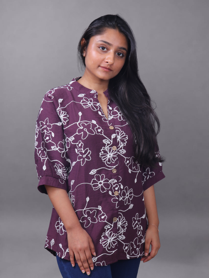 Artisanal elegance to your wardrobe with this beautifully floral shirt. Featuring a clean mandarin collar and a relaxed, breezy silhouette, this piece combines traditional floral motifs with a modern, structured cut.