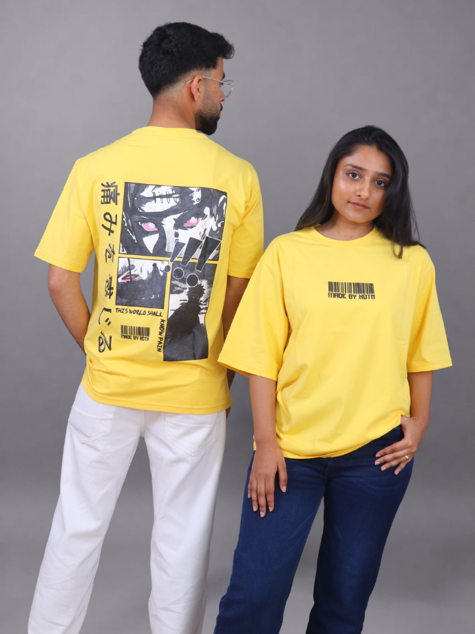 Upgrade your streetwear game with this bold and stylish Yellow Graphic Oversized T-Shirt. Designed for comfort and attitude, this tee blends minimal front detailing with a striking anime-inspired graphic on the back—perfect for those who like to stand out effortlessly.