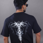 Define your edge with the “Primal Spine” graphic tee, a centerpiece for any modern streetwear rotation. This shirt features an aggressive, high-contrast gothic-style typography on the chest and a detailed, symmetrical tribal-inspired spine illustration on the back.